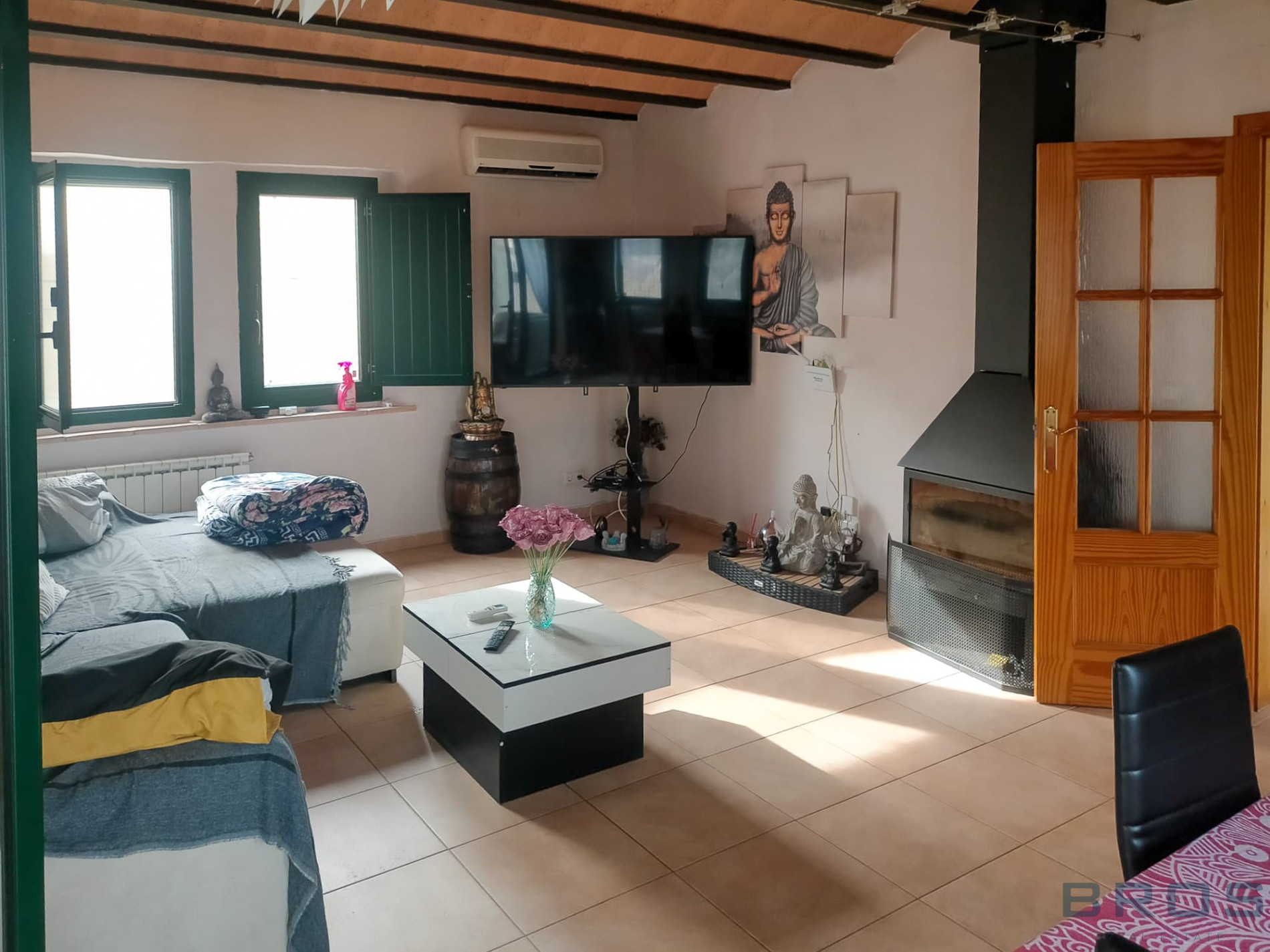 On the ground floor, you’ll find a spacious living-dining room with a fireplace, a fully equipped independent kitchen, two double bedrooms, one complete bathroom, and a beautiful glazed room overlooking the garden — ideal as a relaxation area, summer dining room, or home office.